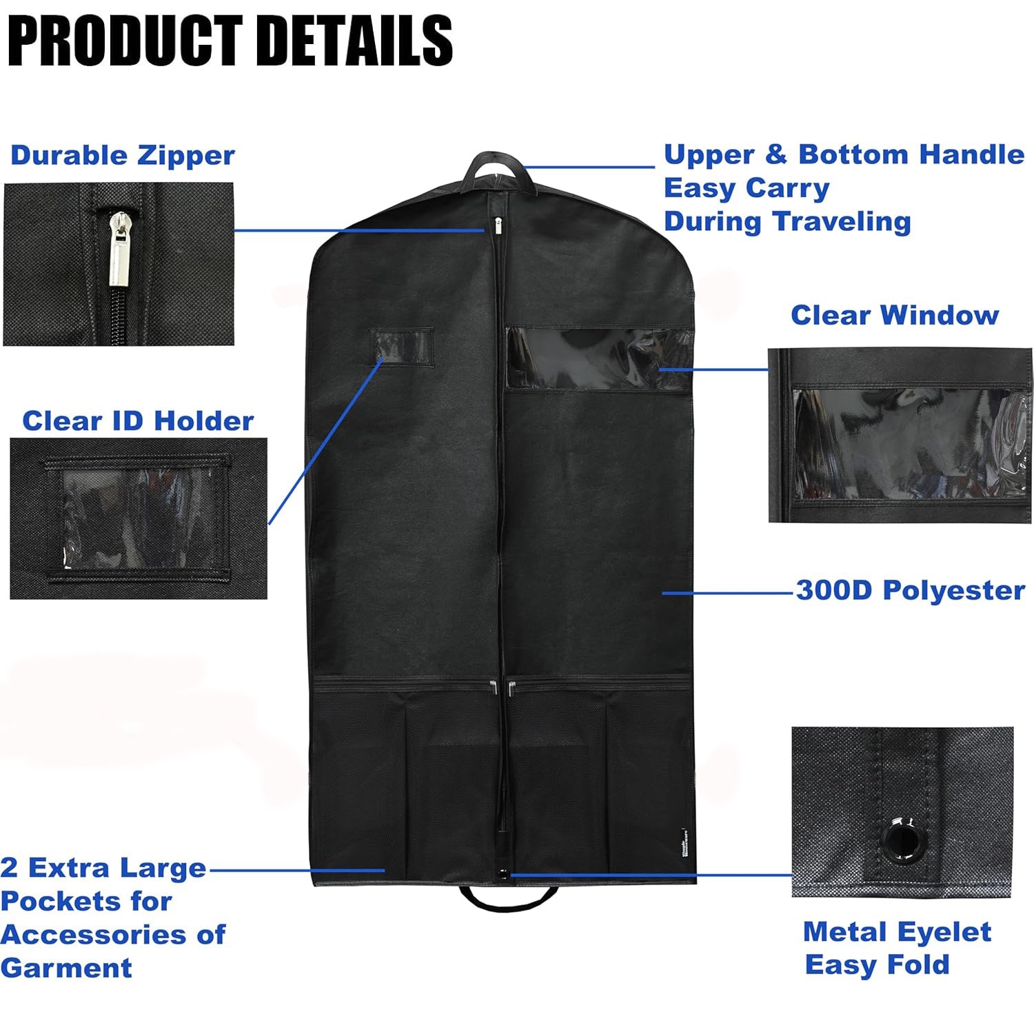 The garment bag includes a bottom iron ring for easy folding, allowing hangers to slide through for compact storage. An adjustable buckle keeps the bag securely folded, while double-thick handles make it lightweight and easy for anyone to carry, including young children.